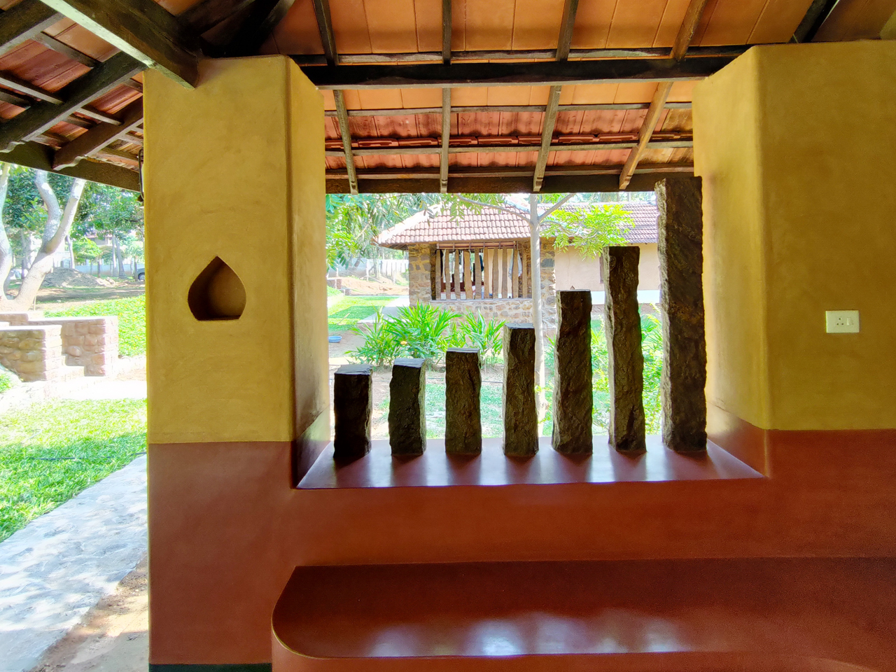 The walls are made using a cob technique that uses a mixture of earth with lime and water. The earth balls are stacked to make a wall and then smoothened to a nice finish. Excessive use of sand is avoided (almost 50%) while plastering the walls.